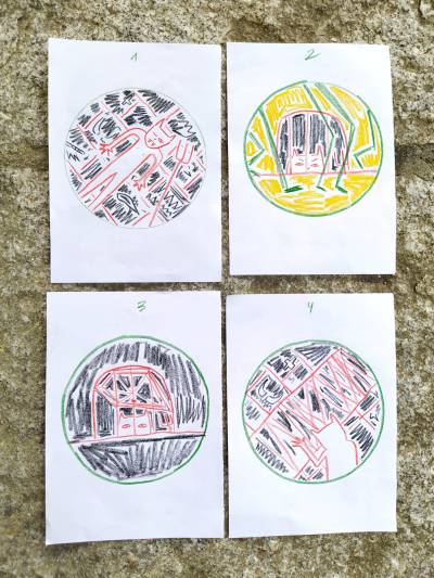 En la segunda parte, cada uno nos centramos en nuestro Cuentacuentos. Creamos a través de las formas y el color, usando el dibujo como herramienta de expresión. Preparamos varias composiciones con el protagonista y las palabras. Cada uno elegimos hacia donde queremos desplegar nuestra creatividad, qué le ocurre al protagonista, y cómo.